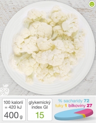 Kalorická hodnota květáku: 100 kalorií = 400 g. Potravina vhodná pro Pestrou dietu. Spočítejte si svůj denní energetický příjem v Kalkulátoru hubnutí.